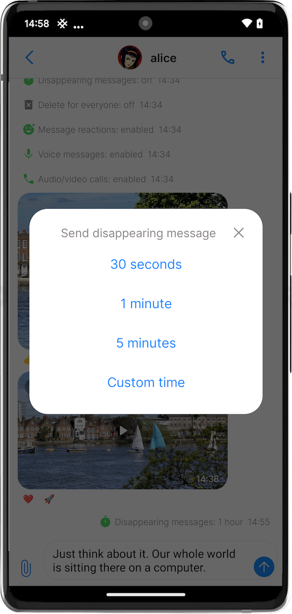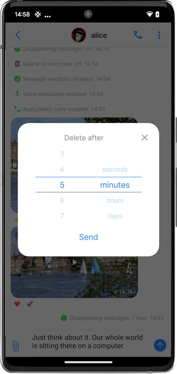 This version allows to configure the time for messages to disappear more granularly, in the range from 1 second to 3 months. You can also set a different time to disappear when you send the message (hold the Send button), as long as disappearing messages are enabled in the conversation.