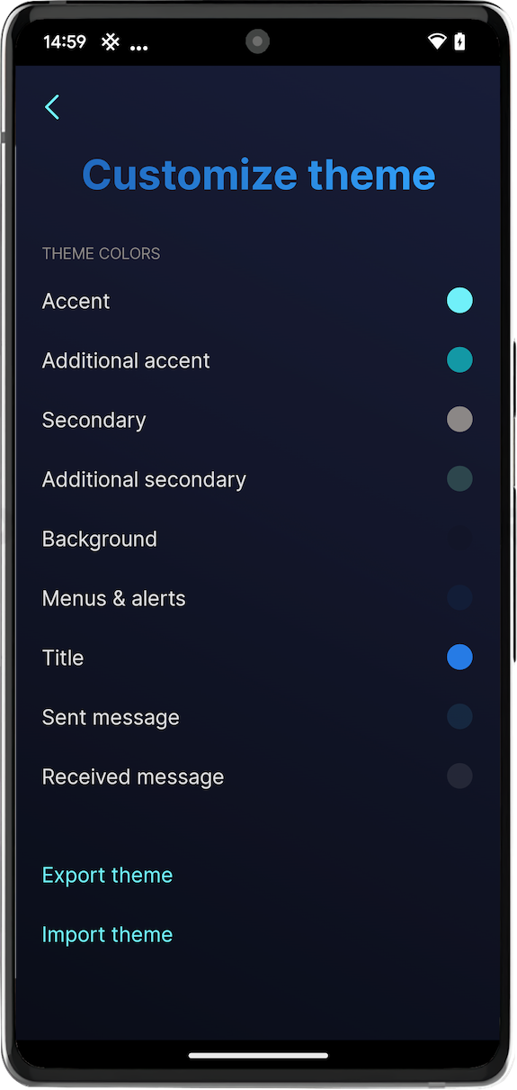 Android app now allows choosing between three color themes - Light, Dark and SimpleX (a dark blue theme). You can customize any theme by setting 9 different colors used in the app, including titles, menus, accent colors and colors for sent and received messages.