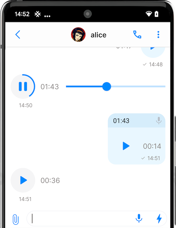 With the new XFTP protocol that allows sending files up to 1gb it is now possible to increase the message size - we decided to limit it at 5 min, increasing their quality 2x (the bitrate is increased from 16 to 32kbps). We also added a slider to control the playback.
