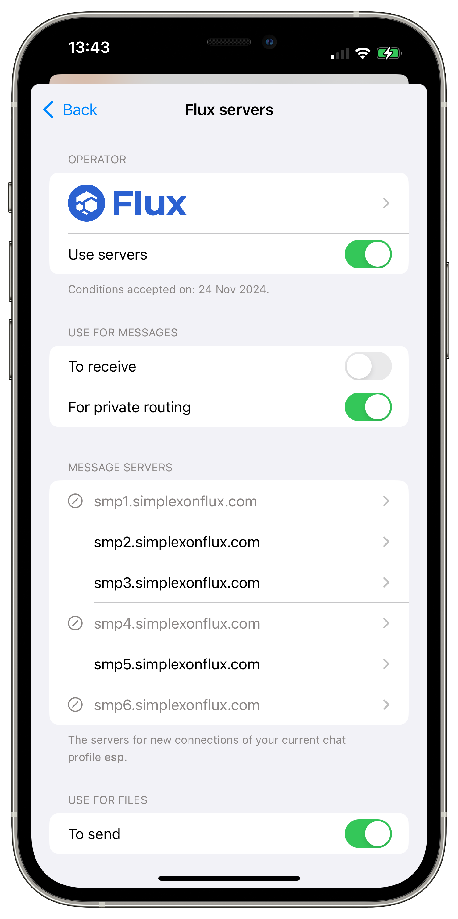 By default, if both Flux and SimpleX servers are enabled in this version, you will be using SimpleX Chat servers to receive messages, Flux servers to forward messages to SimpleX Chat servers, and the servers of both to forward messages to unknown servers. We will enable Flux to receive messages by default a bit later, or you can change it now via settings.